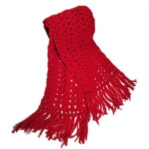 Vtg homemade scarf crocheted bright red with fringe ends 7' long. Cottage core, grandma, grandpa, eclectic grandparents, cozy, warmth, retro, casual, colorful, dopamine, festive, holiday, valentine, winter.