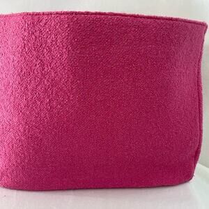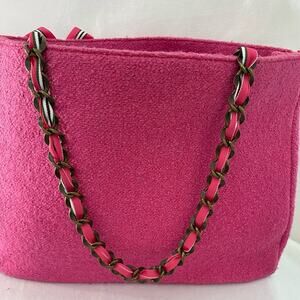 This gorgeous vintage hot pink/magenta Goldie Limited edition shoulder bag tote is made of a wool-tweed like material. This bag can be a shoulder bag or tote. Designed by Goldie from the late 80s early 90s. It is lined in magenta, hot pink silk like fabric. Has a spacious zipper inner pocket. On the front it has the classic in Goldie medallion emblem in the center of a bow. The straps are a bronze metal link with a contrasting pink ribbon threaded throughout each of them. No signs of wear truely, very gentle use for a vintage conditioned bag. Measurements 14 inches length 10 1/2 inches high 5 inches wide at the bottom opens about 2 inches wide strap drop is 9.25 inches.