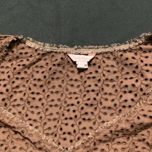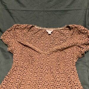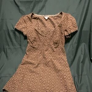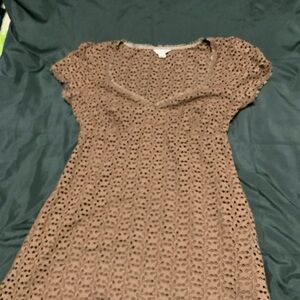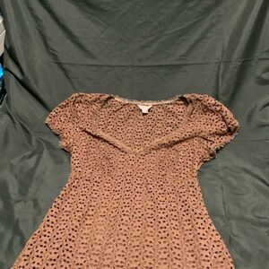 This chic brown eyelet mini dress is a stylish addition to your wardrobe. Perfect for any occasion, its detailed design offers a touch of elegance. Puff sleeves with lace trims on sleeves and bottom .