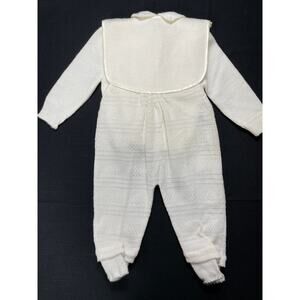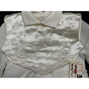 vintage sweater jumper set made in Italy unisex 3 to 6 months, tags are still on it very cute soft knit satin bib with mushrooms and an bear in a parachute vintage from the 70’s Ricamo A Mano white jumpsuit satin, embroidered with original tags