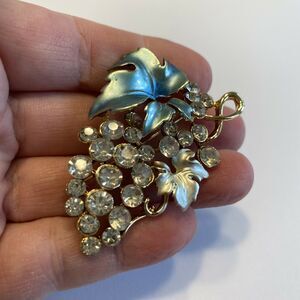 Vintage inspired brooch - charming rose gold tone metal setting with a blue wash finish and a cluster of clear white rhinestones. Designed to a grape leaf motif - gorgeous and sparkling with a simple hook clasp - about 2" long x 1" wide. In excellent pre-owned condition - very light wear - no damage or flaws - so pretty!