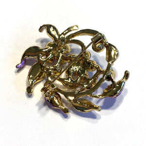 Vintage inspired flower brooch goldtone pink & silver wash white rhinestones