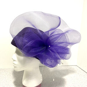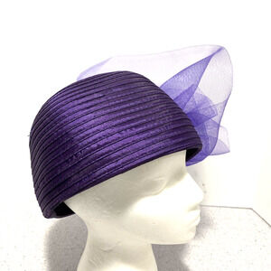 Vintage inspired purple hat with netting bow and faux pearls retro pill box style - the hatband circumference is about 22" diameter and the crown is roughly 5" tall. Tagged polyester - made in China - looks like 2000's does 1940's. Minimal wear - excellent condition with no damage or flaws.