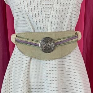 Vintage ione for Coastlines belt in medium. Metal medallion and purple, mint green and cream textured rope strands over a cream suede waist. Rope portion has a few inches of stretch. Silver hook.