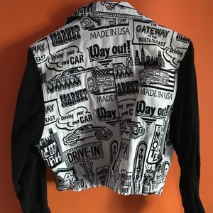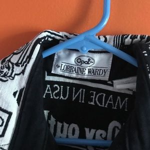 Black & white, New York City/ East graphics & soft sleeves with buttons on center. Size large but fits smaller.