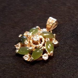 Delicate flower arrangement of jade and rhinestones in gold-plated sterling silver. Ring is size 6, and stone arrangements are each 1/2" in diameter. I don't know who made this set, but it has a feminine Victorian vibe to it. Jade symbolizes well-being and longevity, and is thought to bring good fortune!