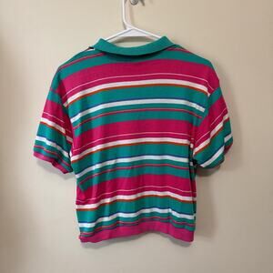 description: vintage made in usa striped polo shirt in bold hot pink, teal, orange, and white. features ribbed hems, short sleeves, and classic fit. perfect for 80s preppy looks, retro y2k fashion, or unisex streetwear styling.