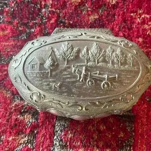 Beautiful ornate vintage jewelry box. The top of the box has a horse pulling a wagon. There is a dog in the field. Beautiful piece.