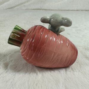 This vintage toothpick holder is a charming addition to any kitchen or collection. The ceramic figurine features a mouse peeking out of a carrot, adding a touch of whimsy to your space. Measuring at 3" length 2.5" high, this small holder is perfect for holding toothpicks.