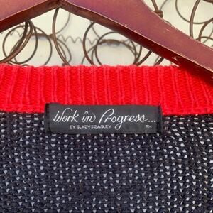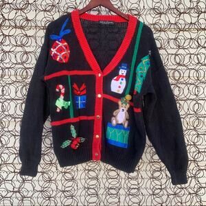 Vintage knit Christmas cardigan ugly sweater by Work in Progress by Gladys Badgley. Features Christmas tree, candy cane, snow man, ornament, presents and Holly.