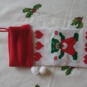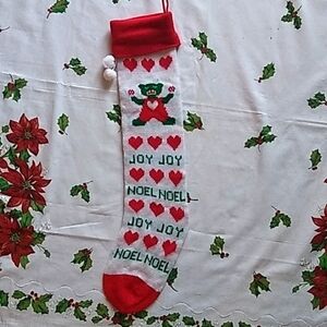 Vintage knitted Christmas Stocking Joy Teddy Bear & Hearts