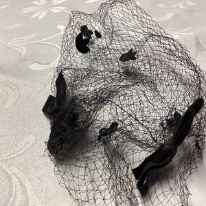 Very simple adorable noted yet easy to wear. Looks lovely over another hat or just playing. These are hard to come by. It’s in mint condition. No tears on the netting meticulously stored no smokers no pets.