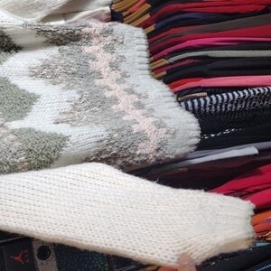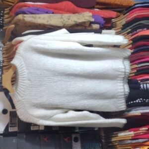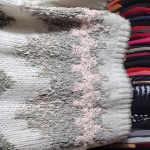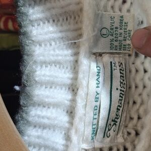 vintage Shenanigans hand knitted sweater in excellent condition has print on it super comfy and cozy for the winter stretchy and breathable cream white green and pink color size large 22 inches pit to pit 27 in Long and is very stretchy