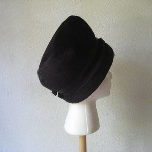 Vintage l 60s Lilli of California Black Faux Fur Double Satin Ribbon Bow Mod Hat.
