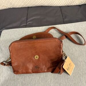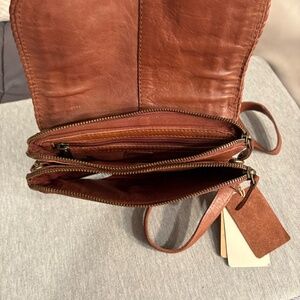 This is a brand new never been carried crossbody bag tags are attached. You can keep the straps on or off. The bag is a brown color and designed beautifully. The bag has a snap magnetic closure and numerous zipper closure compartments inside. The bag is 8.5 inches wide and 6.5 inches long.