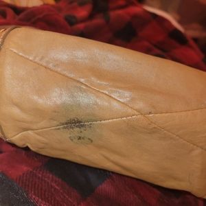 This vintage Michael Kors chain bag is a stylish addition to any wardrobe. The exterior is made of high-quality camel-colored leather with gold accents and studded details. The medium-sized satchel/top handle bag has a magnetic snap closure and measures 8 inches in width, 6 inches in height, and 3 inches in depth, making it perfect for everyday use.