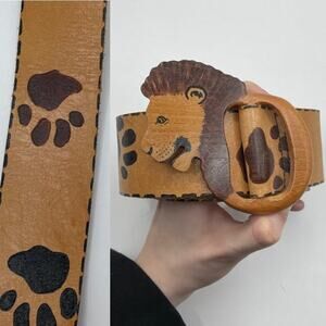 Vintage leather lion head animal paw print belt brown adjustable