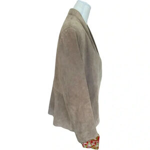 Classic vintage JORDACHE genuine suede jacket in a versatile taupe. Clean, minimal open-front design with subtle seamed edges and full satin lining—easy to dress up or down with denim, dresses, or trousers. Soft sueded leather with beautiful drape.