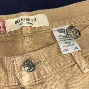 Vintage Levi’s 550 Relaxed Fit Jeans in tan. Size 36x30. Classic straight leg, mid-rise with a relaxed fit through the thigh. Distressed wear on front left thigh and back pocket area, plus fraying at hems — all adding to the natural vintage character. 100% cotton, made in Mexico. Measurements provided in the pictures.