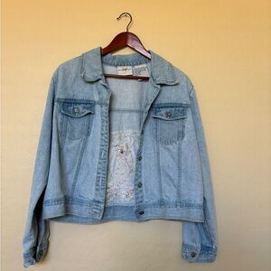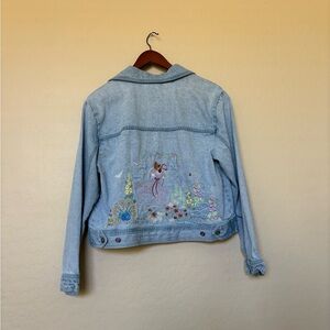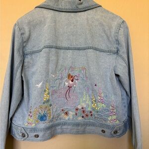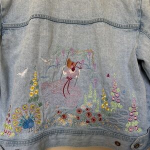 Whimsical Embroidered Denim Jacket – Garden Fairy Scene, Peacocks & Florals (M) 21 1/2 pit to pit | 20 inches in length