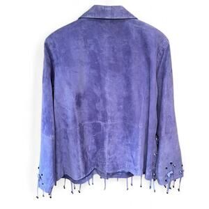 Vintage lilac suede jacket with flowers, beads & fringe details. 100% leather shell. Size XL. Super light scruff on right sleeve as shown in last pic.