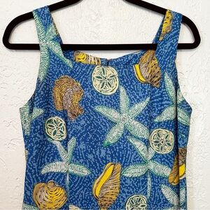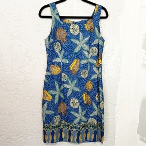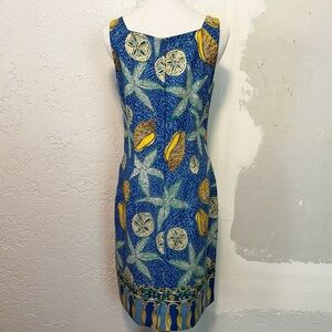 Vintage linen blend seashell sheath dress size 8, brand is Carroll Reed. Zips up the back and has hook and eye closure. Slit in the back. Approximate measurements: