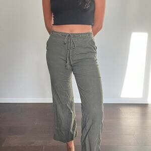 Army green linen pants with braided rope and straight leg. 100% cotton, very little stretch. Japanese brand L&Beautiful. Size 4. Perfect vacations pants.