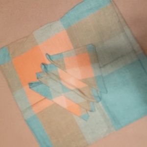 Beautiful peach and green linen table cloth with matching linen napkins. Table cloth is 35 inches square. Matching napkins are 13 and a 1/2 inches square. Comes from a pet and smoke-free home.