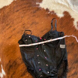 Vintage lingerie heart Lace Mesh Bodysuit high leg embroidered Size L Black