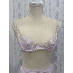 Set includes bra, panties and garter. Color is a very soft purple pinkish with lace appliqué.