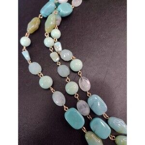 Pretty vintage necklace has a variety of shaped beads in blues and greens. Necklace is 70 inches in length.