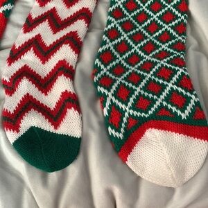 Vintage long knit Christmas stockings red green family set matching pom pom