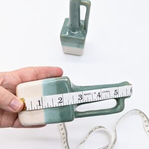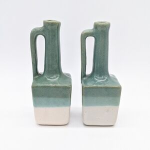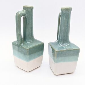 Vintage long neck blue white green ceramic vases with handles. Set of 2. Some bubbles in the glaze on the neck of one, one slightly shorter than the other.