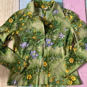Vintage long sleeve and skirt set. Size 16 around a medium. In great pre owned condition. Lightweight comfortable material. Beautiful floral pattern. No flaws. Fabric has come stretch.