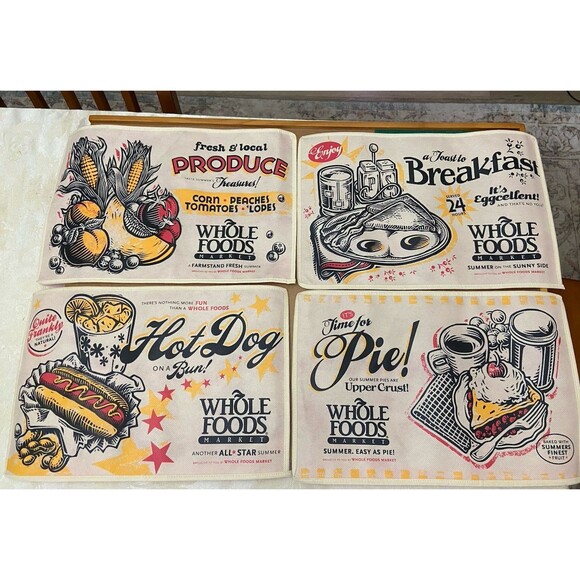 This Vintage look Whole Foods Placemats Set/4 is perfect for adding a touch of nostalgia to your dining experience. Made with high-quality materials, these placemats feature a charming vintage design that is sure to elevate your dining table. The set includes four placemats, making it easy to decorate your table for any meal. Ideal for those who appreciate classic, timeless decor in their kitchen or dining room.