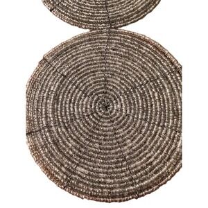 Add a touch of vintage charm to your home decor with this set of 4 beaded silver coasters. Perfect for holidays and special occasions, each coaster features a unique geometric pattern on a round shape. Measuring 4 inches in diameter, these multifunctional coasters can also be used as table decor or a thoughtful gift for friends and family. The material is unknown, but the quality and beauty of these coasters speak for themselves. Packaged in a convenient bag for storage, these coasters are a must-have addition to any home.