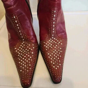 This is an incredible pair of Vaccaro Italian boots made from a deep red, incredibly soft leather! These boots are in fantastic condition with only wear on the soles. Every stud and stone is still in place. The details in these boots are amazing. Aunthentic Australian crystals, amber 5 silver rhinestones. size 38, or 7.5-8. They fit my daughter, size 8 comfortably.