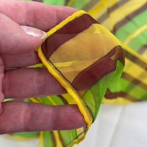 This is an boho oldie. Vinal ( nylon) crepe scarf from 60’’s or 70’s. No flaws. Colors vibrant. No snags or holes. Hand rolled and made in Japan.