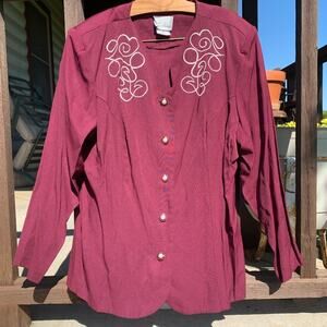 Vintage maroon floral embroidered button down church blouse 20W PLUS SIZE