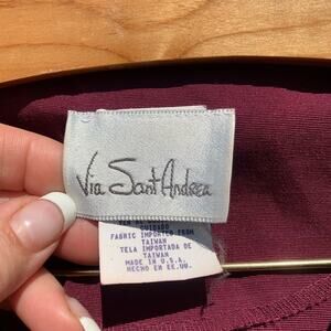The higher the shoulder pads, the closer to god, and this church blouse has them! Stiff shoulder pads, white scroll embroidery on rich berry colored blouse, and faux petal buttons are the epitome of a 80s and 90s ladies’ church suit. This top fits the bill. Via Sant Andrew is the brand. Made in USA. Rayon/Poly Blend. Tag size 20 W