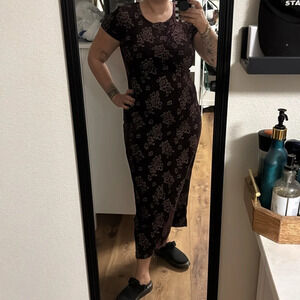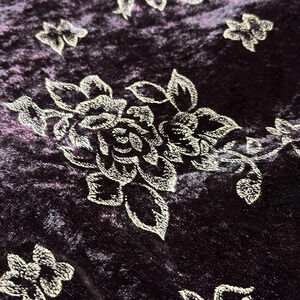 This is a beautiful vintage dress in a sort of velvet/ velour material. The tag has been washed off so I don’t k ow her actual fabric or size, but I can list the measurements and give my best guess. She is stretchy and long. This style can go in all sorts of directions, goth, grunge, or elegant. She’s the best of all worlds. She is a deep purple with a peach/ tan rose stamped design. Keep in mind this is a vintage preloved dress, she may show some wear.