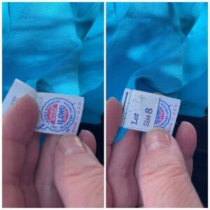 Vintage maxi dress and jacket size 8 ( runs small) teal blue crepe dress. Dark teal like pic #5. Sleeveless dress with cropped jacket. Snap front on jacket with buttons down front. Pit to pit 17” and length 12.5” . Dress has the sweetest light blue collar with ruffles. Empire waist with ties at sides. Pit to pit 17.5” and length 52”. Union labels in dress and jacket no fabric tag but silk crepe type fabric and it has a dry clean only tag.