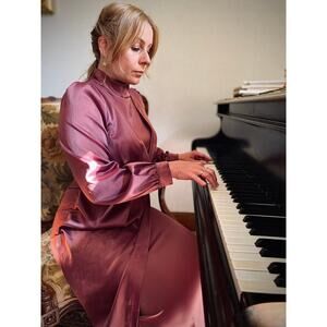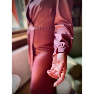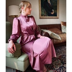 Vintage maxi gown in old mauve with drapes, beads and shiny texture, size 8