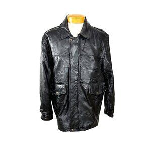 Very nice quality mens black leather jacket by Maxam. It's made of top grain lambskin in an Italian Mosaic design. It's like a patchwork pattern. Lined with black nylon fabric. It has four outer pockets and one inner chest pocket. It closes with a sturdy brass zipper and snaps at top and bottom. Very good condition. Measurements Shoulder 21" Chest 50" Waist 48" Length 32" Sleeves 37" ***Please note that sizes listed in the title, such as S, M or L, are estimates based on the measurements of the garment and used for search purposes. Please take note of the actual measurements and compare with an item of clothing you own to make sure it will fit you.***