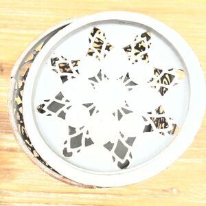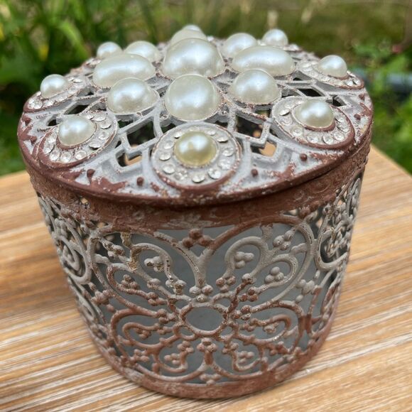 Vintage, one of a kind metal container with beautifully decorated with “pearls” & sparkles lid. Distressed look, lightweight, screams “history!”. Size about 3.4 x 4.25.