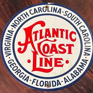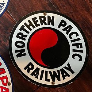 4 metal vintage model train signs. 2 large (approx 12" diameter) and 2 small (approx 9" diameter). $5 each