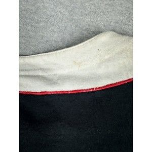 Yellowing around the collar and along the buttons. Yellowing around the hand cuffs. Staining around the back of the neck