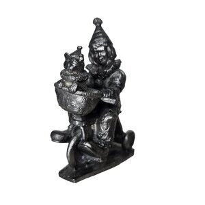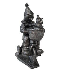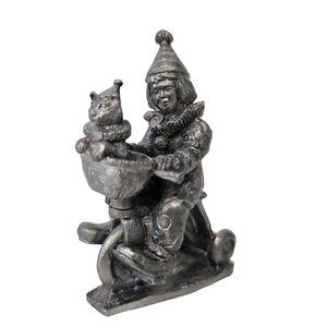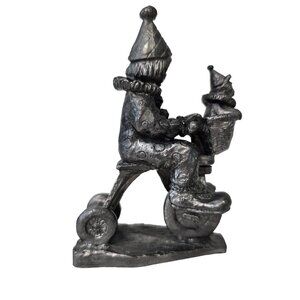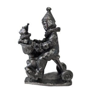 This charming vintage pewter figurine captures the whimsical essence of a clown riding a tricycle, complete with a cat nestled in a basket. The intricate detailing highlights the clown's expressive face and the textured basket, making it a delightful addition to any collection or decor. The durable pewter material ensures longevity, and its compact size makes it suitable for display in various settings.