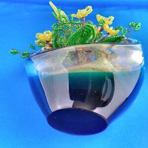 This is a beautiful mid century art glass with hand made seed bead flowers in yellow with green leaves set into florist foam.