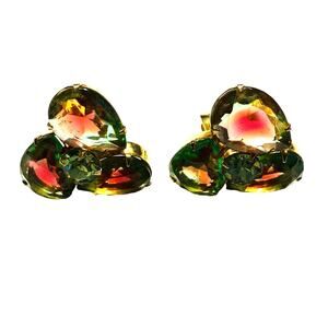 Vintage mid century clip on earrings watermelon green pink glass stones on gold